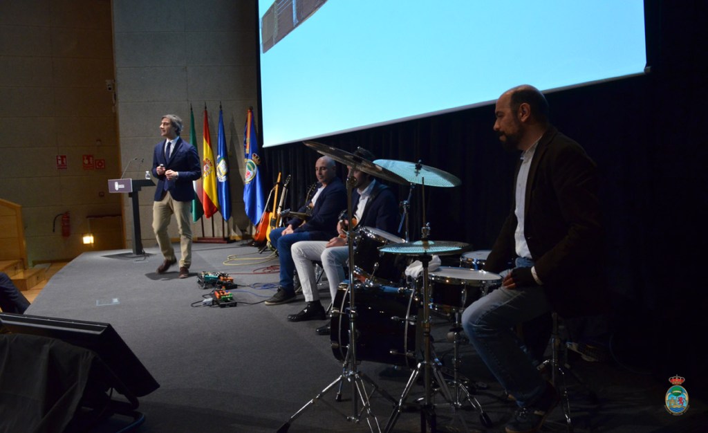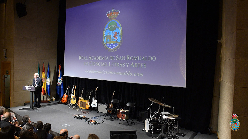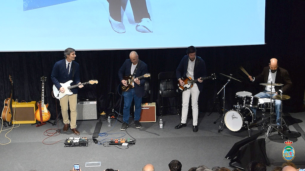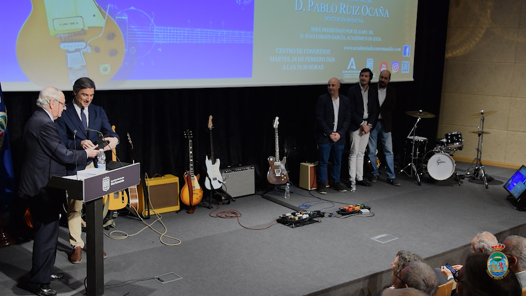 Así lo afirmó D. Pablo Ruiz Ocaña en la charla que el pasado martes 24 de febrero pronunció en un abarrotado auditorio del Centro de Congresos. El doctor en Medicina y afamado estudioso de este instrumento musical ofreció todo un recorrido por la historia de este instrumento que nació en la década de los años 20 del pasado siglo bajo un concepto que puede parecer tribal pero capital para que fuera una realidad: «Loud is More Good», que traducido resulta algo así como cuanto mayor volumen, mejor. La máxima está fuertemente asociada a Josh Scott, fundador de JHS Pedals, y Ruiz Ocaña la utilizó estratégicamente en su disertación proyectándola en varias ocasiones durante una aprovechadísima hora de conferencia que tuvo de todo: desde una introducción de la historia de la guitarra hasta un mensaje final, eso sí, algo desalentador, aunque para olvidarnos de él y dejarnos un gran sabor de boca su conferencia finalizara con todo un repertorio de más de una decena de cortes de emblemáticos temas compuestos o interpretados por guitarristas y grupos inolvidables, tocados además por la banda que, desde que eran adolescentes, conforman el propio Pablo Ruiz y sus amigos Luis Ruiz Jalón (bajo), Sergio Carrillo Rego (guitarra eléctrica) y Antonio Olvera Calderón (batería). Una especie de quiz musical, si permiten en anglicismo, que permitió a los numerosos asistentes al acto adivinar tema por tema interpretado con apenas un segundo antes de que en pantalla aparecieran sus autores. Y por el lienzo blanco del Centro de Congresos pasaron por unos instantes, en un Bonus Track (de nuevo abusamos del anglicismo) del miniconcierto de Pablo Ruiz y sus colegas, artistas como Chet Atkins, Chuck Berry, The Beatles, The Kinks, Deep Purple, AC/DC, Chris Isaak, The Police, Nirvana… Toda una pléyade de estrellas y grupos consagrados ante nuestros ojos y los muchachos del conferenciante ante nuestros oídos. Combinación generada por la Academia de San Romualdo en su afán por ser un bastión de la cultura en todos sus ámbitos y campos. Y la música de cualquier estilo no es menos.
