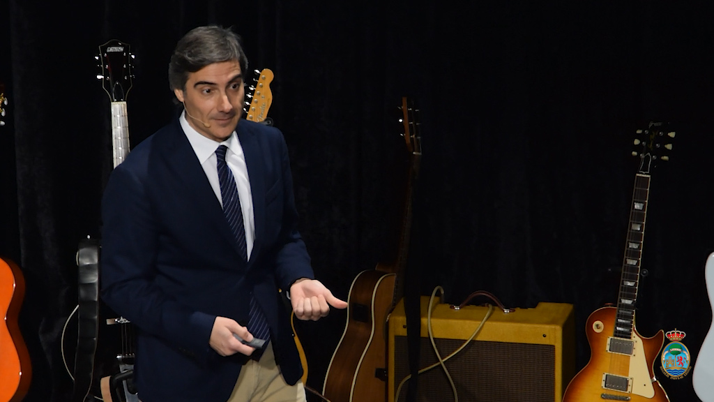 Anécdotas, momentos de evolución del rock abruptamente abortados (¡cuánto daño hizo enviar a la mili a Elvis Presley!) o agoreros como Dick Rowe, magnate de la importante firma Decca Records que fue capaz de afirmar categóricamente en 1962 que «los grupos de guitarras no tienen futuro», y una extensa lista de nombres sagrados de las cuerdas como Dave Gilmour, Eric Clapton, Keith Richards, Carlos Santana, Mark Knofpler, Kurtk Kobain y un largo etcétera surgían de la boca (y a veces de la guitarra) de Pablo Ruiz Ocaña. No podemos dejar de citar que, antes de introducir de lleno al espectador en el mundo de la guitarra amplificada, el conferenciante, en sus palabras de reconocimiento de la historia del instrumento, citó la importancia de la guitarra española y subió al escenario el joven Mario Ruiz Fernández para interpretar una pieza clásica durante unos instantes.